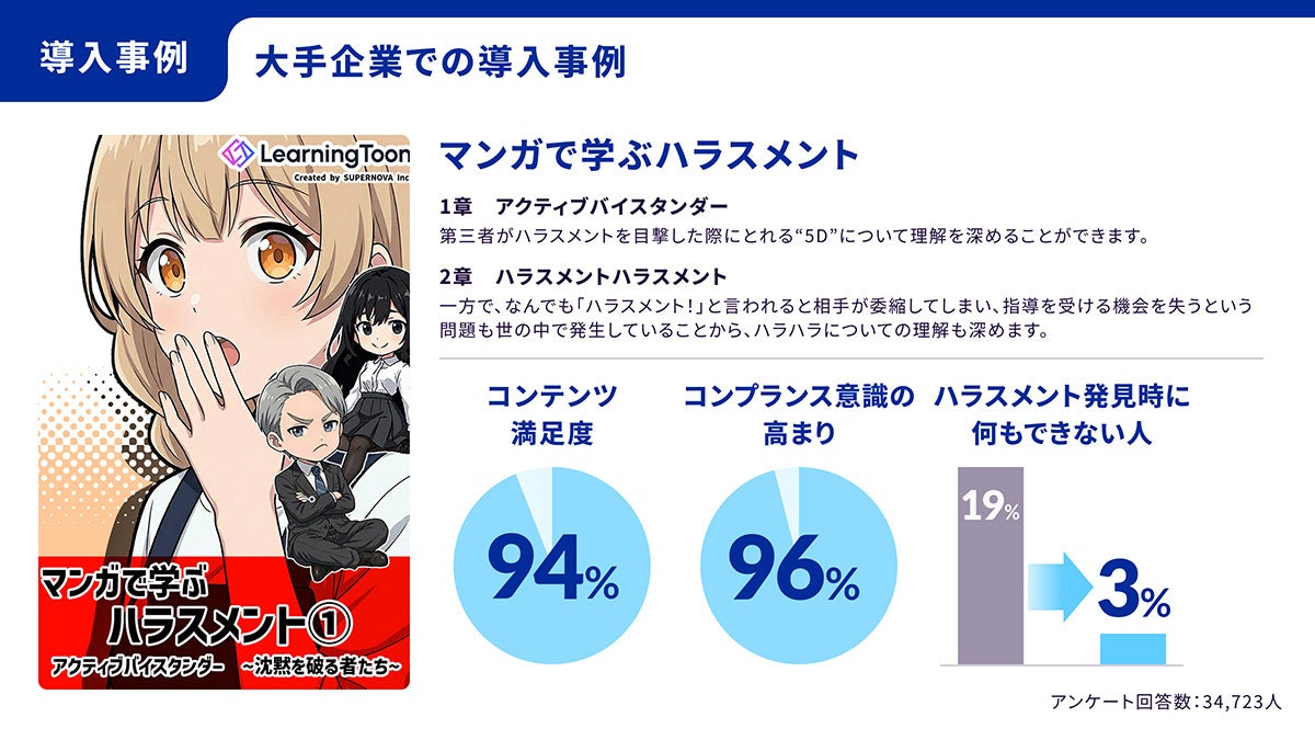 大手企業でのハラスメント研修マンガでは、コンテンツ満足度94%、コンプライアンス意識の高まり96%を記録。また、「ハラスメント発見時に何もできない」と回答した受講者は、受講前19%から受講後3%へと大幅に減少しました(アンケート回答数:34,723人)。