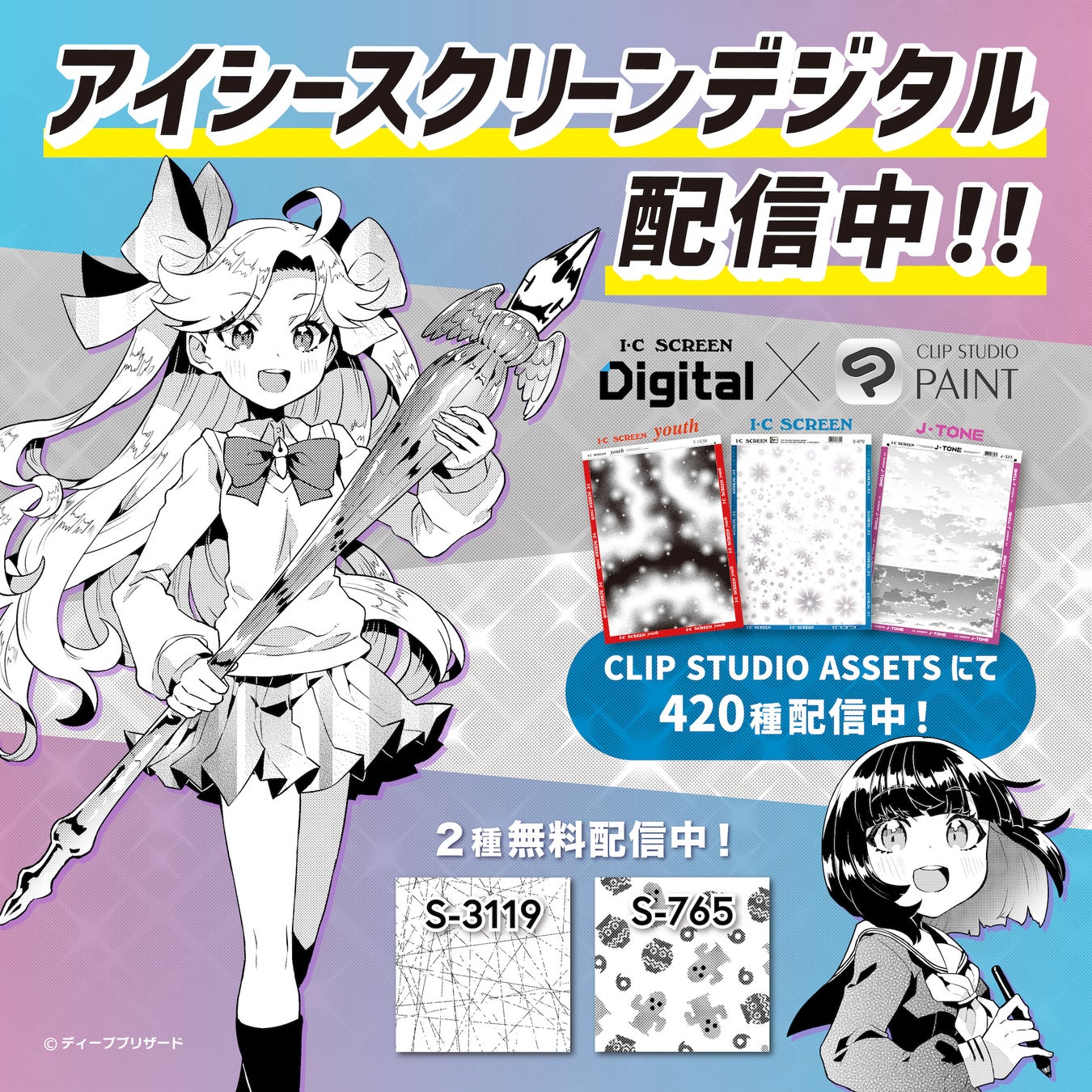 「アイシースクリーンデジタル」とは、漫画家をはじめとした多くのユーザーからのご要望にお応えし、漫画画材のアイシースクリーンをデジタルイラスト制作ツールでも使用できるように開発したデジタルデータ素材です。