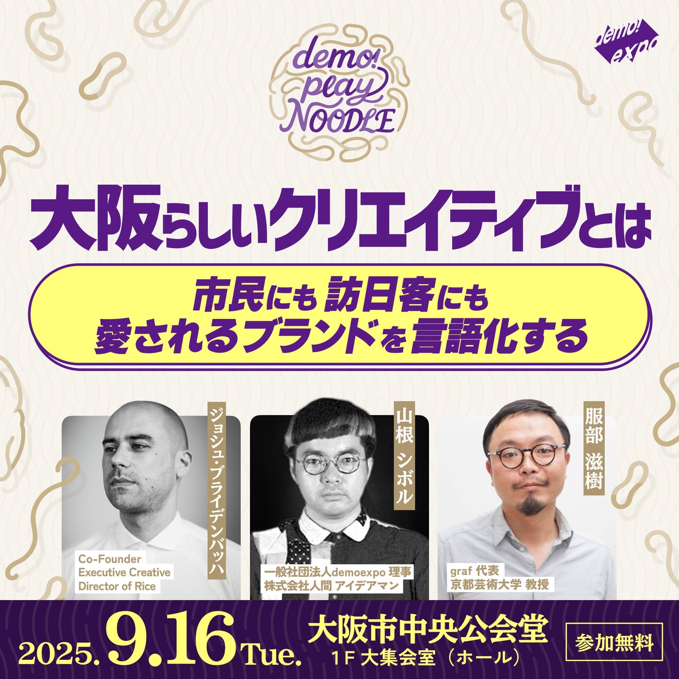 2025年9月16日(火)、一般社団法人demoexpo(所在地:大阪府大阪市西区京町堀1-12-11 愛晃ビル4F、代表理事:花岡、以下「demo!expo」)が、大阪市中央公会堂にて開催する未来カンファレンス「demo!play NOODLE(以下、NOODLE)」のプログラム詳細をお知らせします。本カンファレンスは、開幕以来demo!expoが主催してきた夜のパビリオンプログラムの一貫として開催し、都市・文化・産業の“その先”を議論し、実践につなげる実験的な場として展開します。企業、自治体、クリエイター、都市関係者、スタートアップ、観光・文化事業者など、多様なプレイヤーが一堂に会し、アフター万博から始まる大阪から未来の都市像を描き出します。