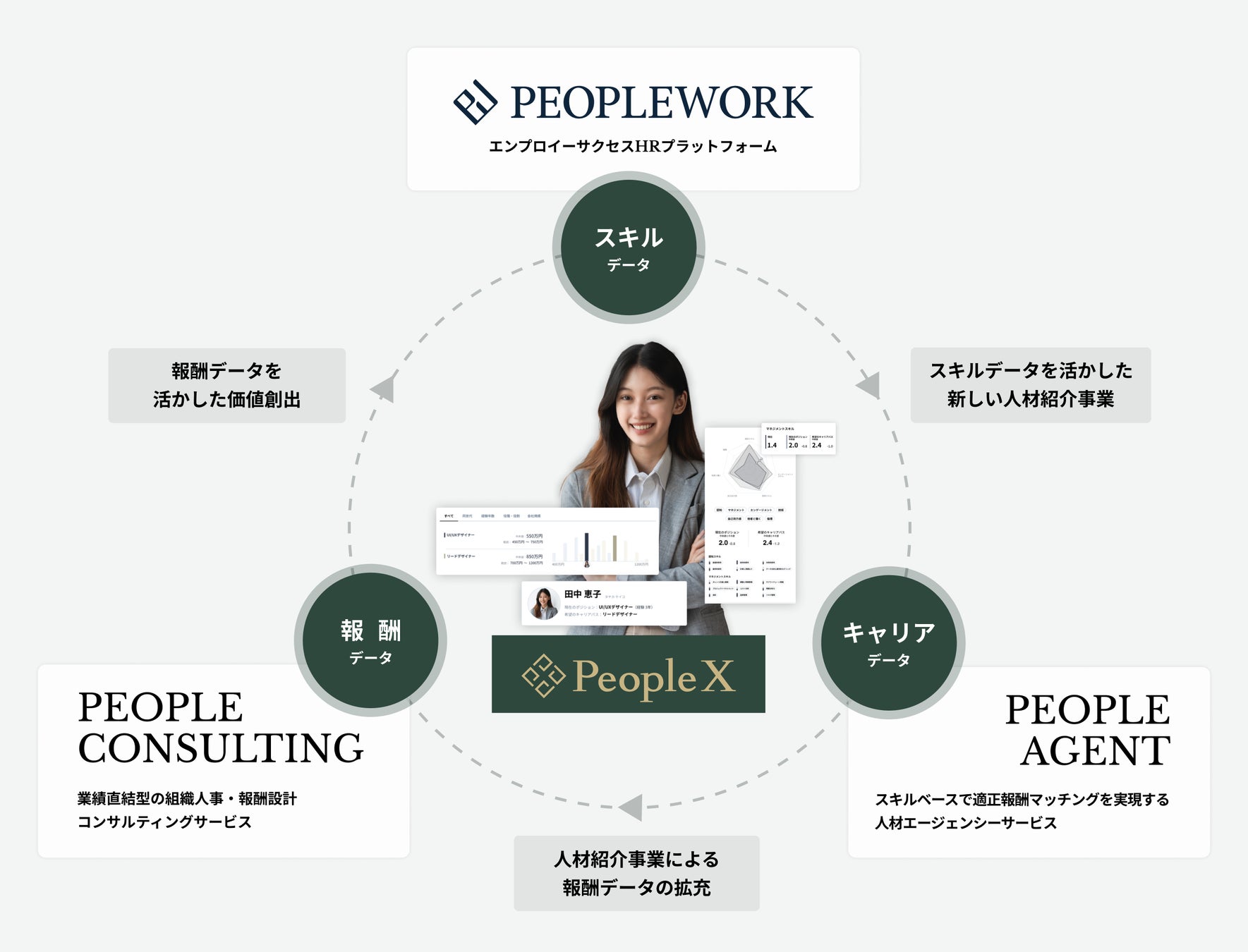 当社では、300社を超える企業様の導入実績をもとに、「スキル」を中核にした3種類のPeopleDataを保有しています。これらを活用することで、新しい時代に適合した総合型HRカンパニーとして新たな価値を生み出す事業展開を進めています。