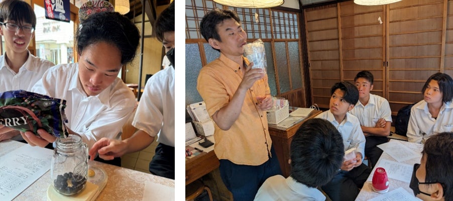 商品開発に試行錯誤する、北村みそ本家の北村社長と常翔啓光学園の高校生