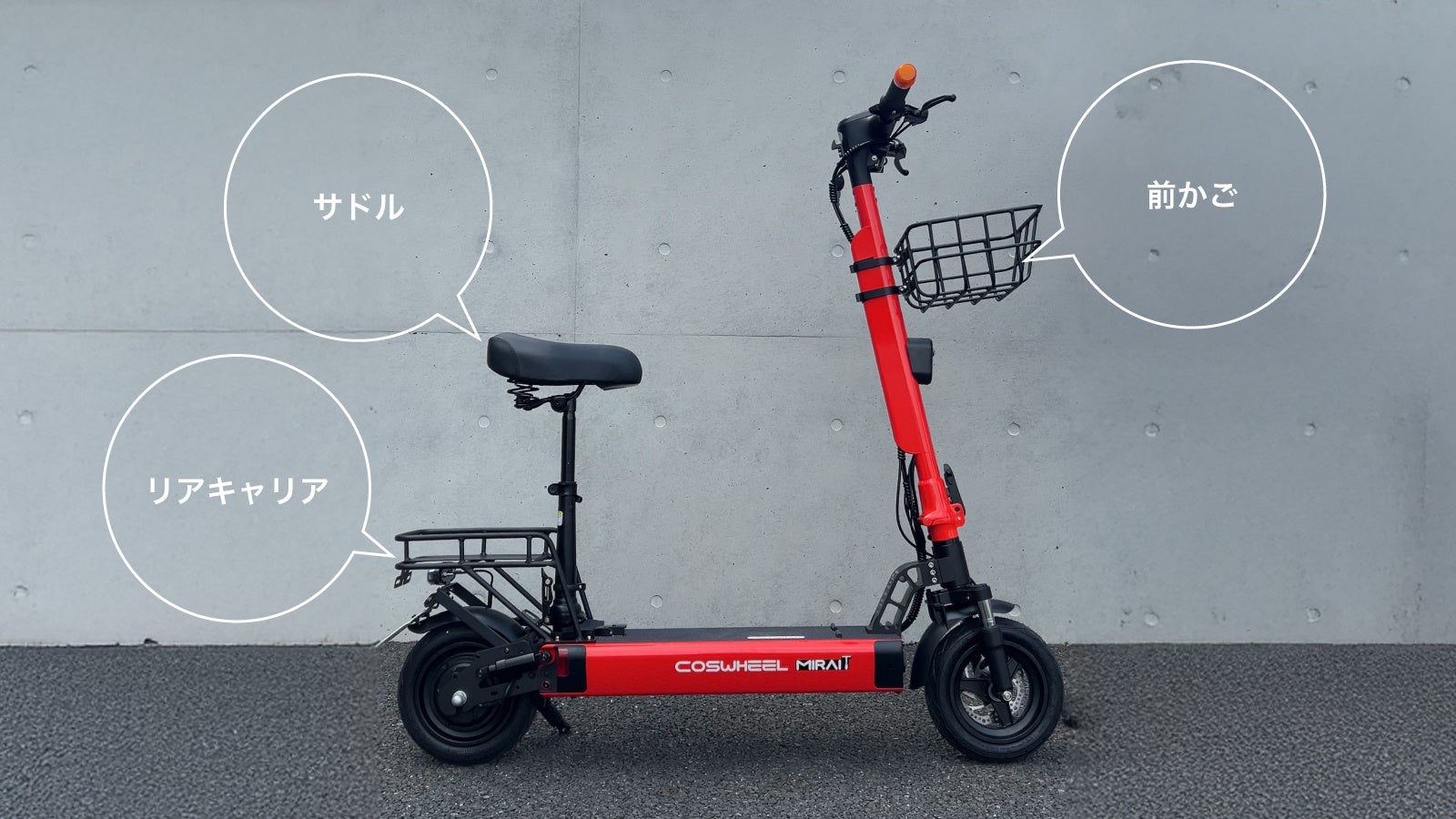 COSWHEEL MIRAI T Liteは、都会に溶け込む洗練されたデザインと、前カゴ・リアキャリア(オプション品)のカスタマイズ可能な実用性を兼ね備えた特定原付電動キックボードです。