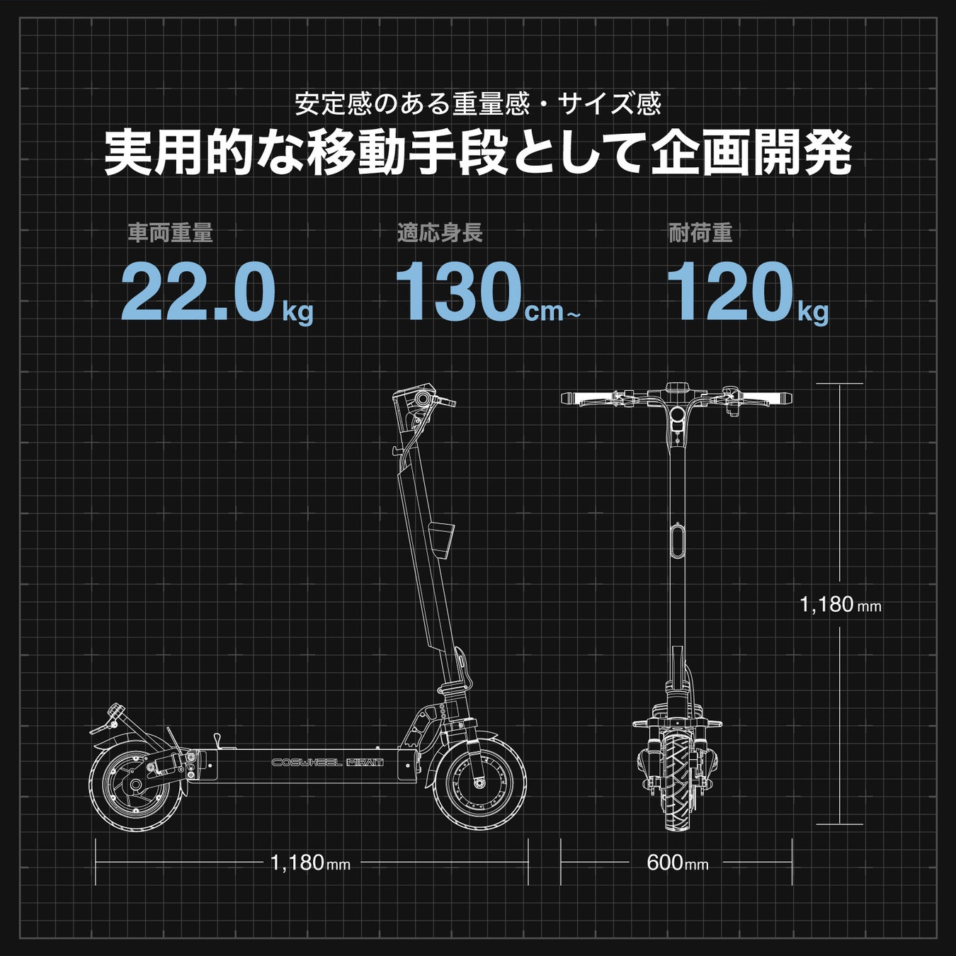 COSWHEEL MIRAI T Liteは実用的な移動手段として企画開発されており、フレームは安定感ある重量とサイズ感のバランスが取れた電動キックボードです。500Wハイパワーモーター搭載で力強く安定した走行を実現します。
