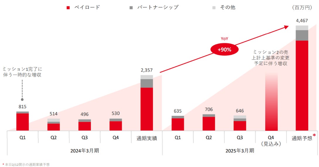 「ispaceは1月15日に無事ミッション2のRESILIENCEランダーの打ち上げを完了し、その後も順調にマイルストーンを達成しながら歩みを進めています。この順調な進捗も踏まえ、弊社監査法人との協議の結果、原価発生の進捗度合いを合理的に見積もることが可能になったと判断され、ミッション2に係る売上計上基準を従来の「原価回収基準」から「履行義務の進捗度に基づき収益を認識する方法」へと変更する予定となりました。これにより、当初来期に予定されていたミッション2の売上総利益の計上が今期に前倒しで計上されることとなり、今期Q4での大幅な増収増益を見込んでいます。