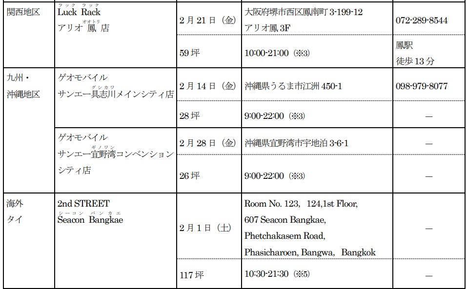 新たに、「セカンドストリート」3店舗、「ゲオモバイル」5店舗、「ラックラック」1店舗、「カプセル楽局」4店舗の合計13店舗が2025年2月度にオープンします。