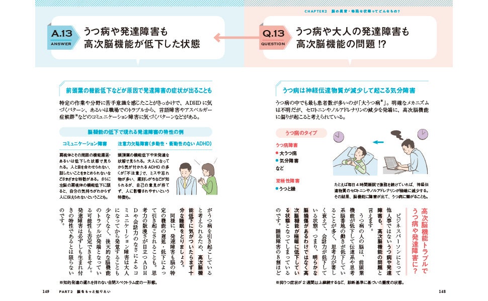 本書の後半では、脳の俗説について、最新の脳科学的な知見から解説。「脳は10%しか使われていない」「右脳型・左脳型」「脳は遺伝する」などの真偽がわかります。また、誤解されることが多い「発達障害」や「高次脳機能」についての理解も深められます。