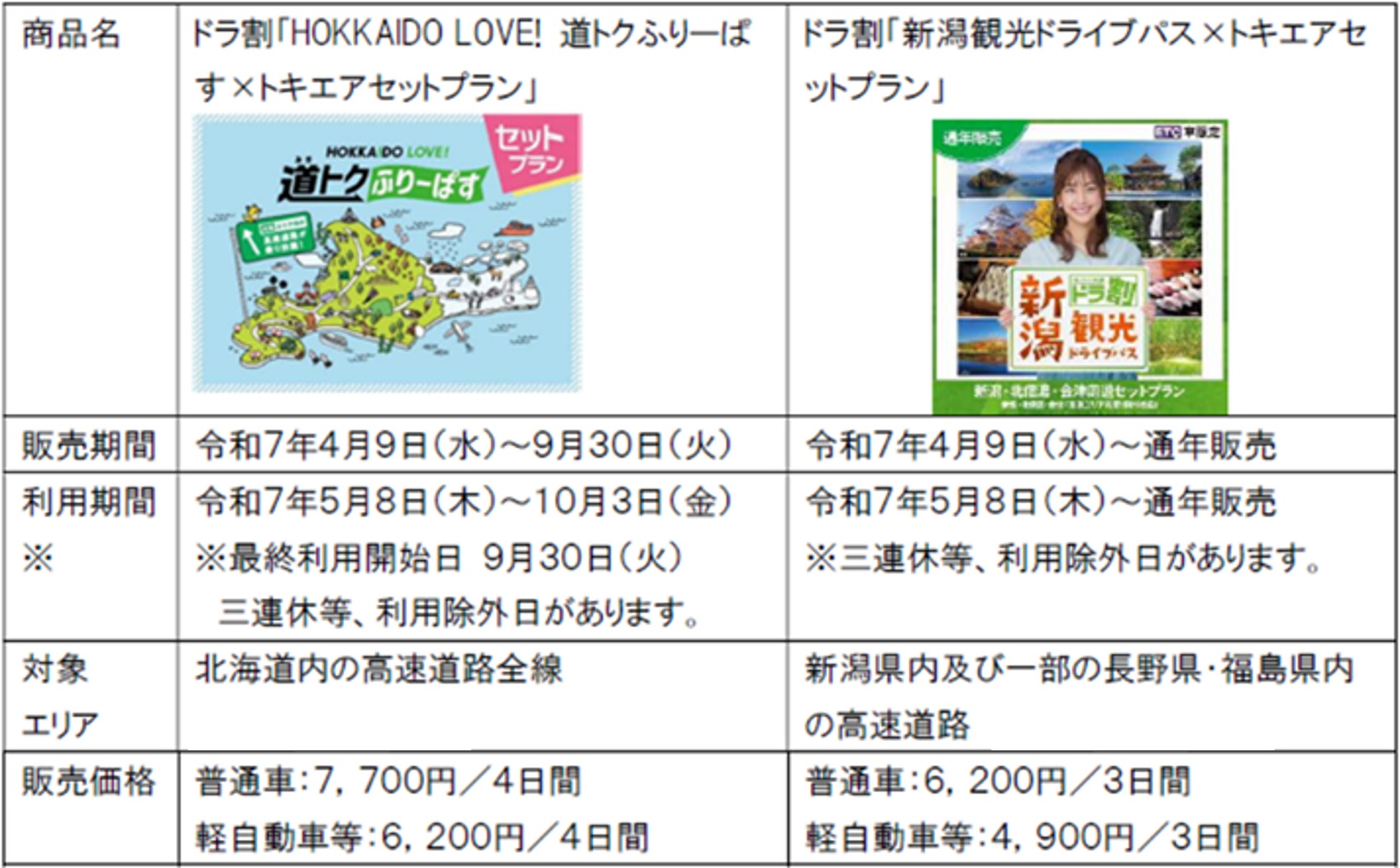 通常のドラ割(※1) と比べ、さらにお得にご利用いただけるプランとなっておりますので、ぜひこの機会にトキエアと高速道路をご利用いただき、新潟・北海道・エリアのご旅行をおトクにお楽しみください。