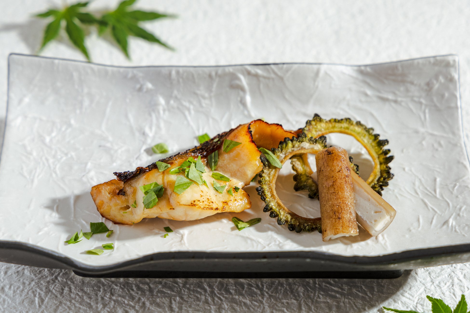 旬のスズキを味噌だまりの漬け出汁に漬け込んで焼きあげ、蓼の葉を散らし、滋味深く