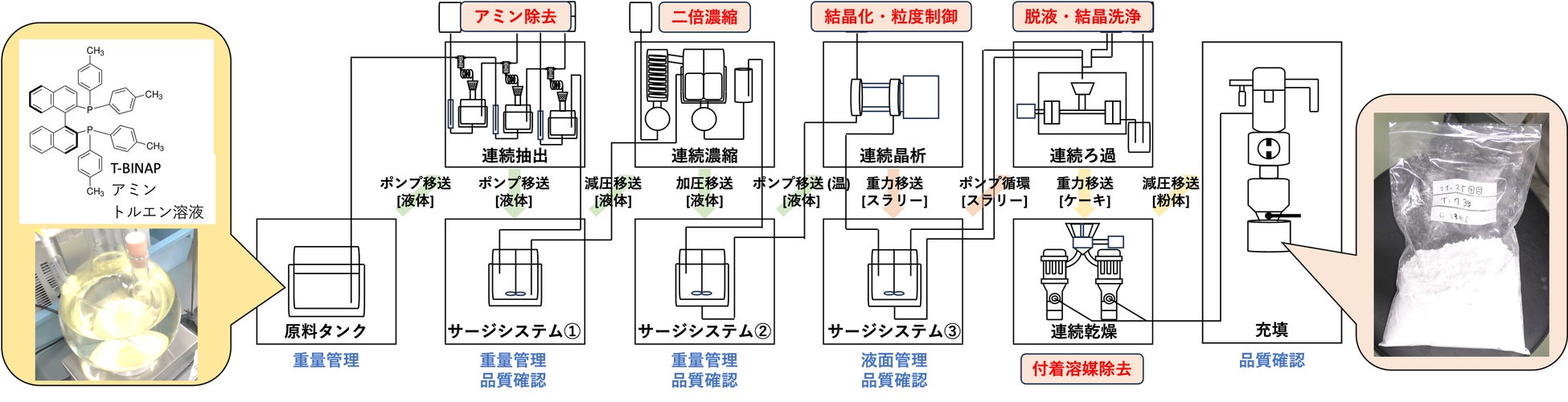 各単位操作を接続して連続的に処理すると、反応混合物(T-BINAPや不純物であるアミン、溶媒であるトルエンなど)の入った精製用原料タンクから充填のパッキングまで人の手に一切触れることなくT-BINAP乾燥粉体を得ることができます。各単位操作を7時間以上連続稼働させたところ、T-BINAP 1 kgが溶解したトルエン溶液から純度99%以上の乾燥粉体730 gを得ることに成功しました。