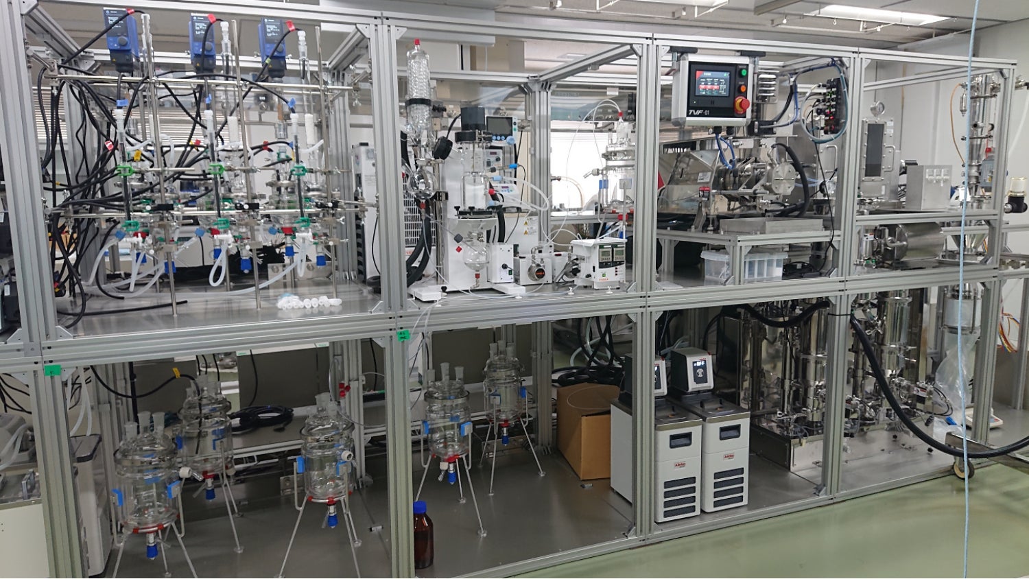 機能性化学品の精製工程における、原料供給・抽出・濃縮・晶析・ろ過・乾燥・充填の7つの単位操作を連結し自動化を実現