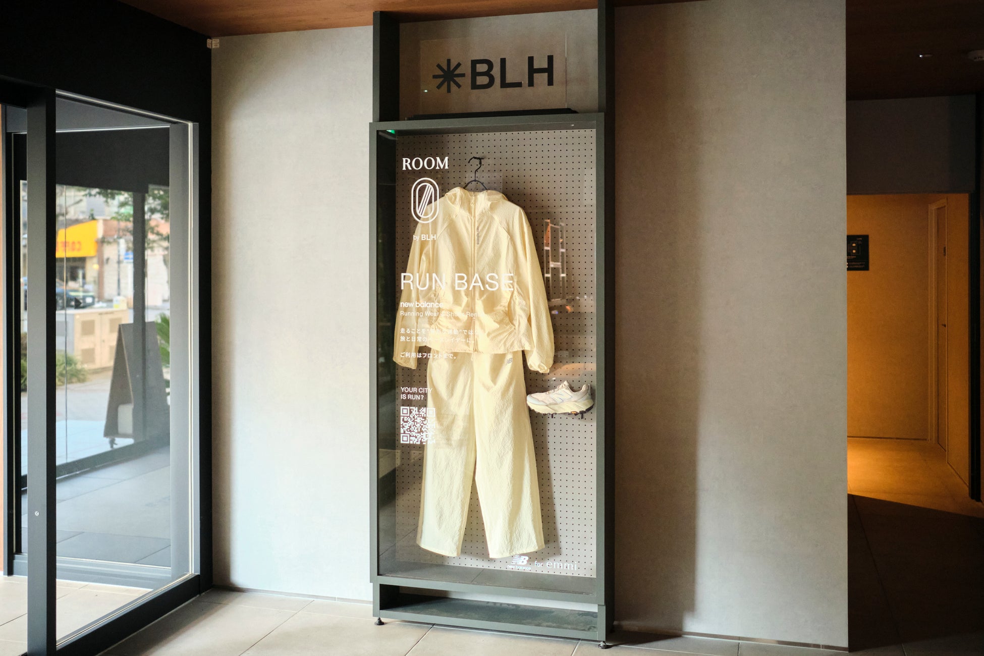emmiチームの宿泊期間に合わせて「BASE LAYER HOTEL NAGOYA NISHIKI」のエントランスには、“ROOM 0” by BLH のディスプレイを設置。上記、New Balance for emmiのウェアやシューズを展示しました。