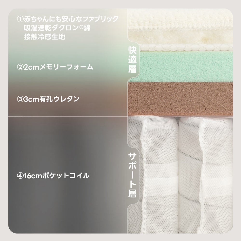 リバーシブル仕様で季節に合わせて使い分けでき、夏は通気性よく、冬はしっかりとした寝心地を実現。独立ポケットコイルが体のラインに沿って体圧を分散し、寝返りを打っても揺れにくく、安定した眠りをサポートします。