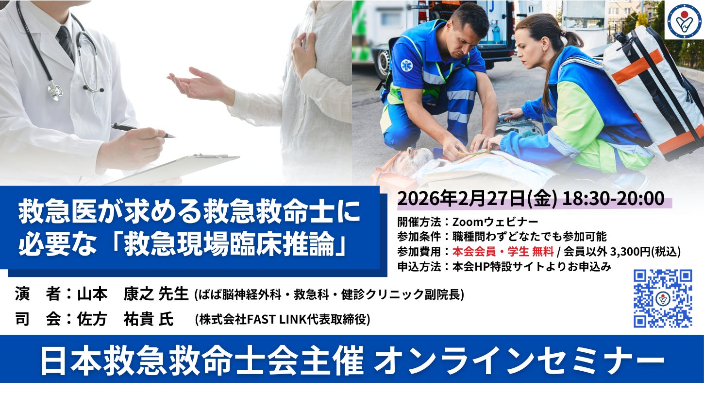 日本救急救命士会主催 オンラインセミナー「救急医が求める救急救命士に必要な『救急現場臨床推論』」を開催します。