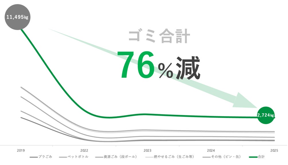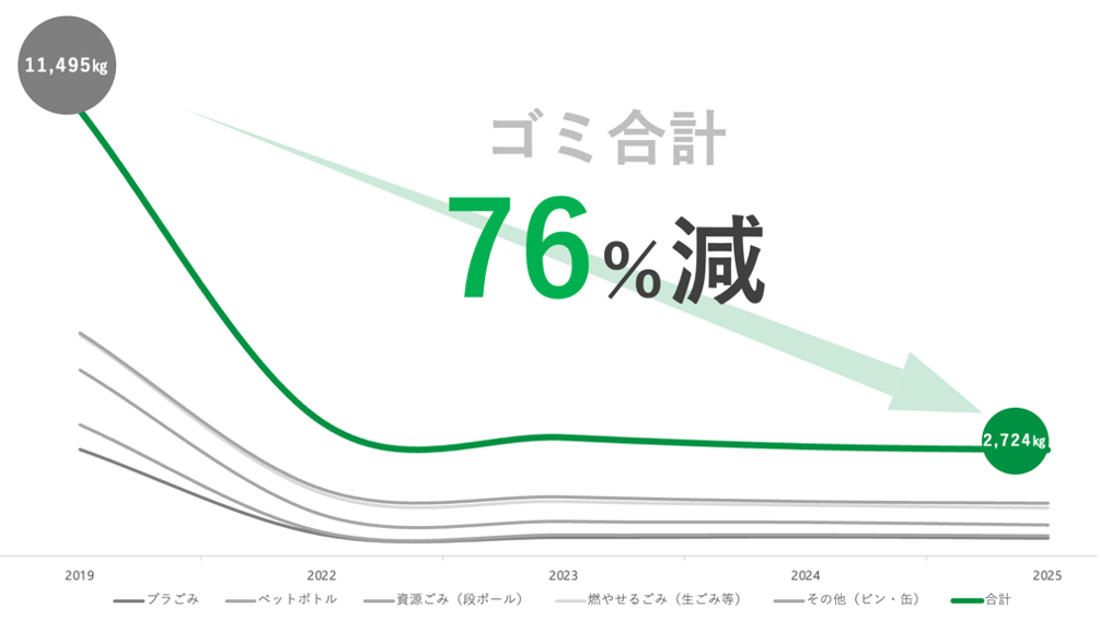 マイカップ・マイボトルマラソン導入以前の2019年大会では、ゴミ排出量が11,495kgに達していましたが、段階的な施策強化と参加者の高い理解・協力により、2025年大会では約76%の削減を実現しています。
