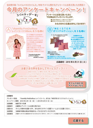 8月のプレゼントは、「chantilly baby & childレインコート」と「MEISTERクッション」。アンケート(巻末はがき、もしくはWEB版)にお答えいただいた方の中から、抽選で8 名様にプレゼントします。