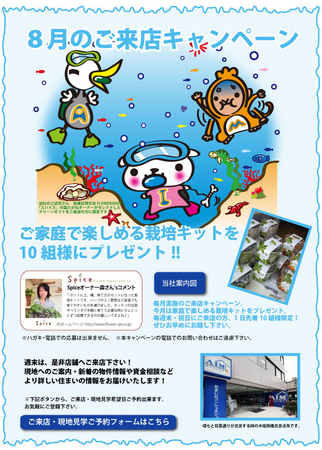 ご来店プレゼントは、家庭で楽しめる野菜とハーブの栽培キットです。8 月の土曜、日曜に来店されたお客さま先着10組の方に差し上げます(野菜、ハーブいずれか一つ)。両プレゼントとも数に限りがございますので、お早めのお応募、ご来店をお勧めします。詳細はWEB版「AIMHOUSE TIMES」(下記アドレス参照)でご覧いただけます。