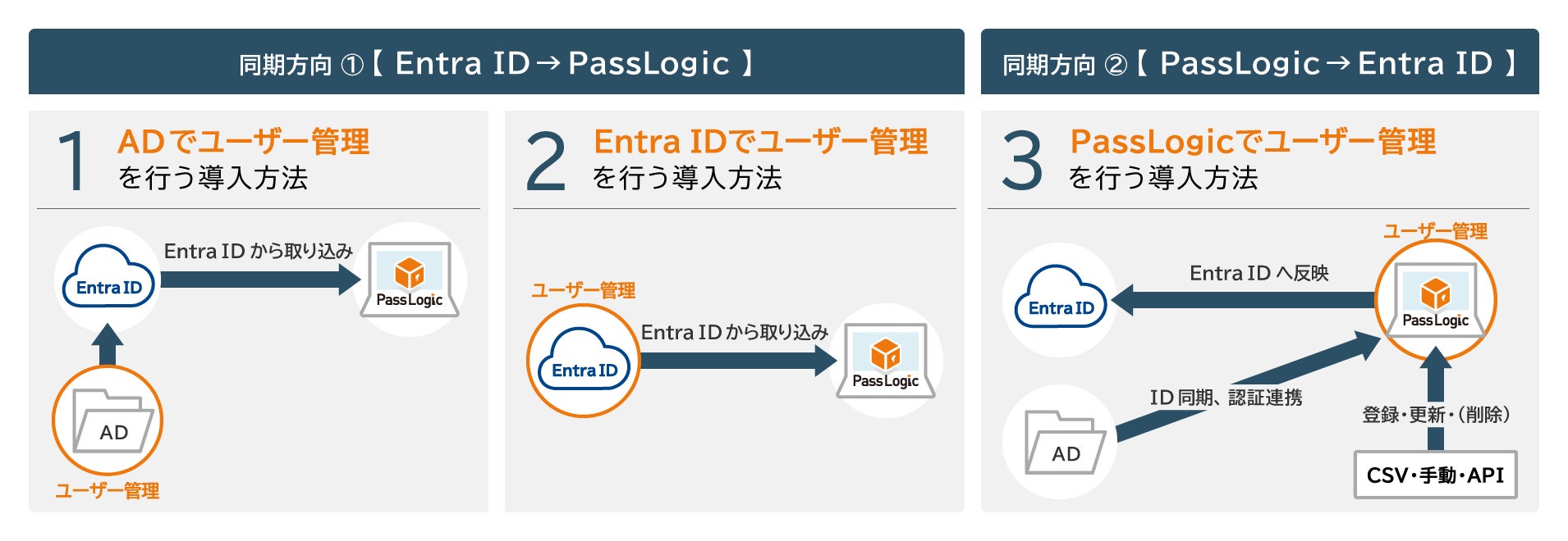 利用環境に応じて、Entra ID → PassLogic、PassLogic → Entra ID のいずれの方向からでも同期が可能です。