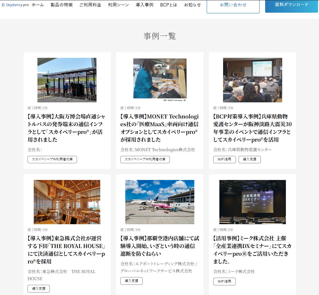 サービス内容の詳細や導入の方法に加え、自治体や大規模イベントなどでの通信障害対策の事例も数多く掲載。通信のBCP対策を考えるヒントになる情報をご提供