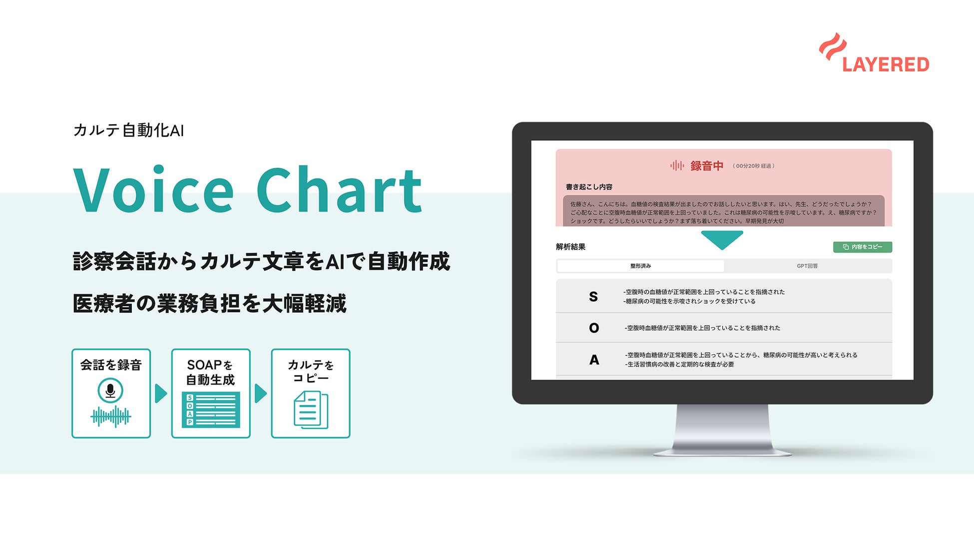 株式会社レイヤード(本社:福岡市博多区、代表取締役社長:毛塚牧人、以下レイヤード)は、株式会社pipon(本社:東京都中央区、代表取締役社長:北爪聖也、以下pipon)が開発・提供するAIカルテ作成支援サービス「ボイスチャート」(アルファ版)の販売取扱いを開始しましたことをお知らせいたします。