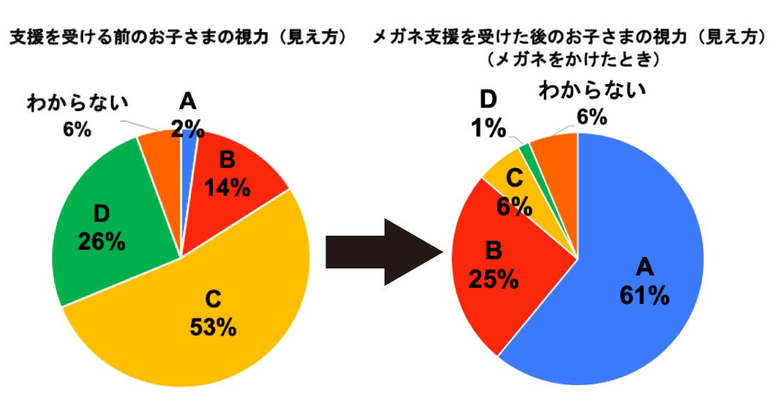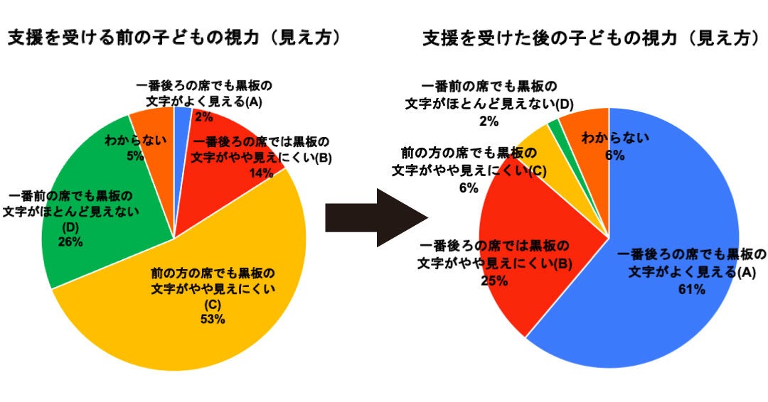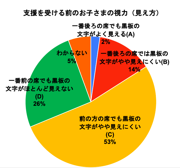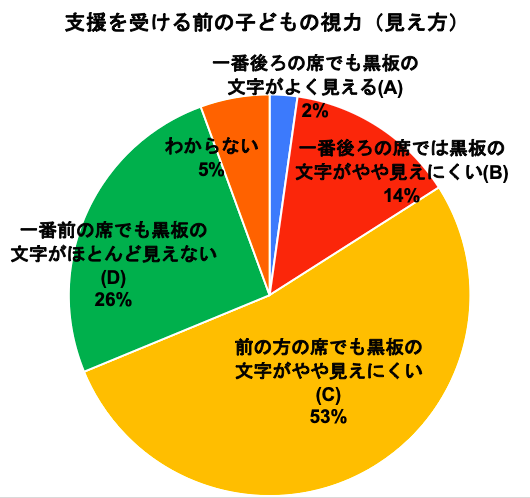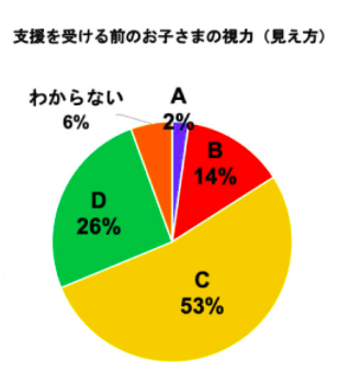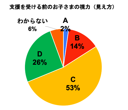 支援前の視力を、学校健康診断での視力検査「ABCD」の4段階評価の結果を参考に聞いたところ、約80%が「前の方の席でも黒板の文字がやや見えにくい」程度である「C」以下の視力だったことが分かりました。その中で、「一番前の席でも黒板の文字がほとんど見えない」「D」以下の視力だった子どもは26%にのぼりました。
