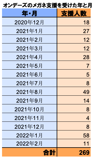 当団体が事前に「グッドごはん」利用者へアンケートとヒアリングを行い、家庭状況とアンケート内に記載している学校健康診断での視力検査「ABCD」の4段階評価に基づき、「D」「C」「B」評価の子どもを優先的にプロジェクトの対象としています。当団体が毎月作成する申込者のリストをもとに、株式会社オンデーズ様の対象店舗にてメガネの受け渡しをしています。
