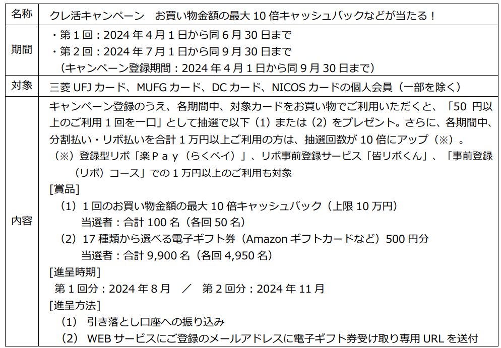 三菱UFJニコス、カード会員向けにキャンペーン実施!1回のお買い物金額の最大10倍キャッシュバックなどが当たる!!