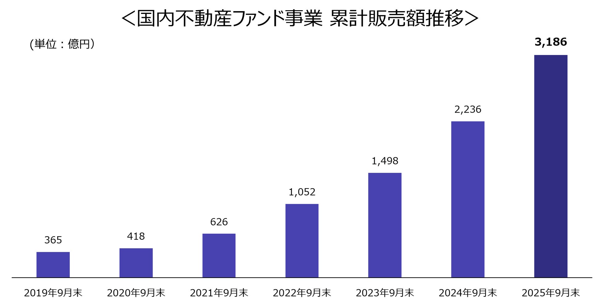 当社は、お客様の資産運用、資産承継ニーズにお応えするため、国内不動産ファンド事業において、安定的な運用収益が見込まれる東京都心および国内主要都市の不動産に、1,000万円から投資可能な不動産小口化商品を提供しております。2025年9月期におきましても、潤沢な期初在庫という強みを背景に、お客様からの旺盛な需要に対して積極的な販売を推進し、5期連続となる過去最高の年間販売額を達成いたしました。その結果、2025年9月末日時点にて、国内不動産ファンド事業の累計販売額が3,000億円を突破いたしました。