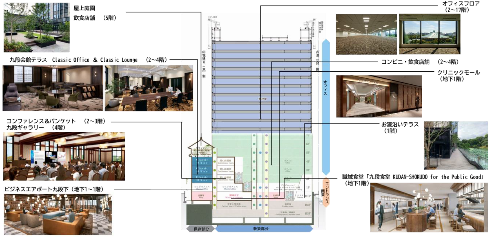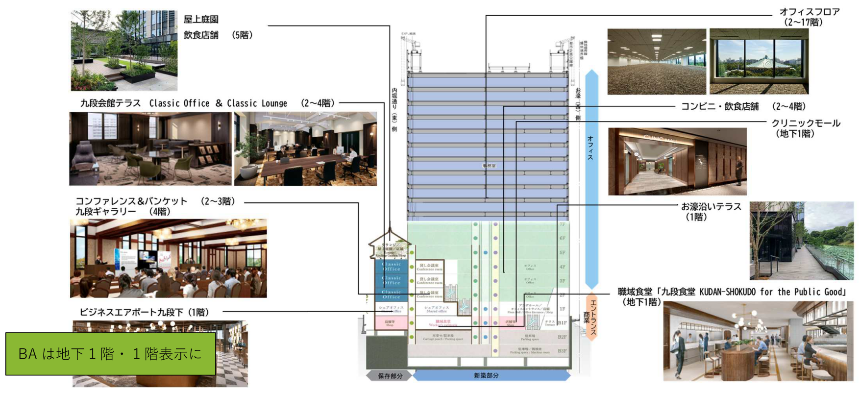 施設内には東急不動産が展開する会員制シェアオフィス「ビジネスエアポート九段下」と、これに併設し、健康なコミュニティを創造する「九段食堂 KUDAN-SHOKUDO for the Public Good」、創建当時の意匠を保存・復原した宴会場を含む「九段会館テラスコンファレンス&バンケット」、オフィスワーカーの健康サポートや利便性を高めるクリニックモールや店舗など、様々な付帯施設を備えており、単なるオフィスビルにとどまらず、お濠端の地を活かした回遊性やこの地の持つ歴史と格式を両立させた、“ここにしかない魅力”を持つワークプレイスを目指しています。