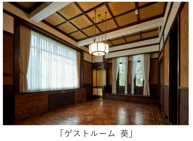 これまで応接室・役員室として使われていた部屋はパントリーなど後年に設置された箇所を撤去した上で補修・復原し、「ゲストルーム 雅・葵」として生まれ変わりました。90年前の雰囲気そのままに、寄木貼りの床や絹織物(紗織)の天井、そしてそれらに合わせてセレクトしたデザイン性の高い家具がオーセンティックな空間を演出します。