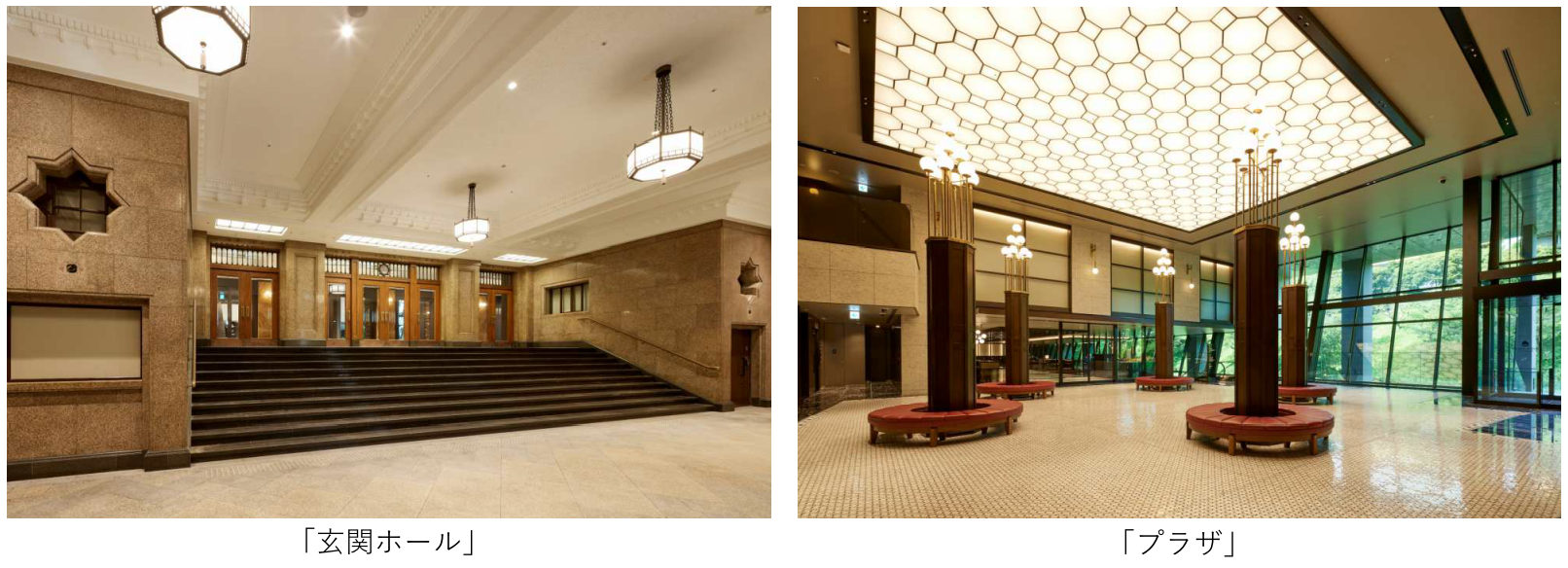 建物正面の玄関ホールは、創建当時から床や壁に用いられてきた大理石を活用し、重厚な雰囲気を持たせています。この大理石に違和感なく溶け込むよう、床や天井なども創建時の素材に近い風合いでありながらモダンさを併せ持つ建材を厳選し、レトロモダンな空間を演出しています。天井高7mのゆったりとしたプラザは、保存部分と新築部分の外壁をモチーフとした内装で囲まれた、半屋外の雰囲気を演出しています。
