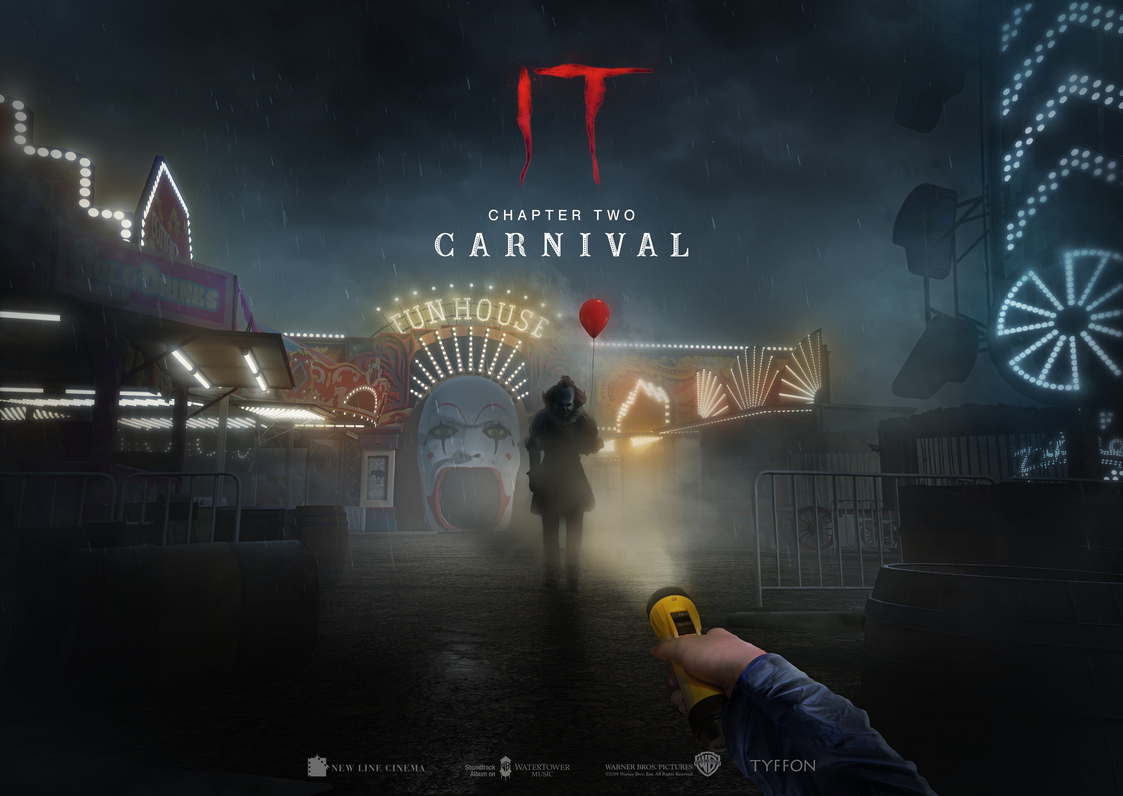 「IT/THE END」の前日譚となる本作では、行方不明となった子供を探すため、あなたは近所の住人たちと共に、本編でも登場したカーニバル会場へと足を踏み入れます。手に持った懐中電灯でVR空間を照らしながら、夜の移動遊園地内を歩いたり、ライドに乗ってさらに奥へと進むことができます。