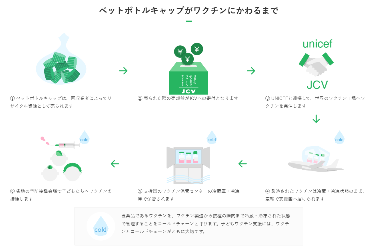 (ペットボトルキャップがワクチンに換わるまでを動画で紹介中 https://www.youtube.com/@npo_jcv)