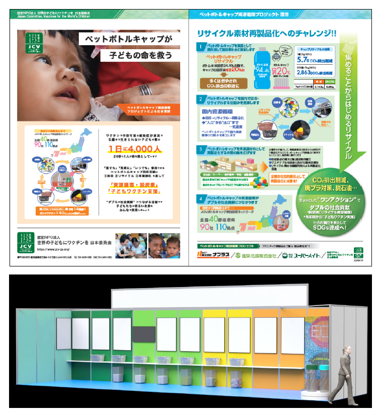 今回の出展では、入口となる回収事業者から再生素材を製造するリサイクル事業者、出口となる再製品化を行うメーカー、そして、ペットボトルキャップ回収を通じた子どもワクチン支援を行うJCVまでが協力。ペットボトルキャップの回収・リサイクルによってプラスチックの資源循環が生まれ、同時に、ワクチン支援によって感染症から途上国の子どもの命を救うまでを一気通貫でご覧いただけます。