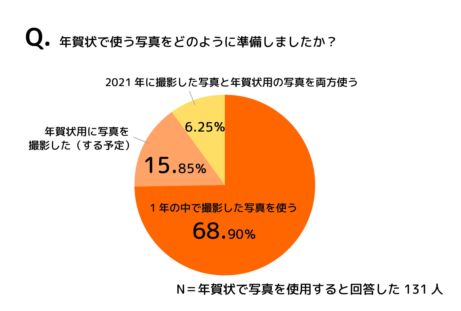 さらに、年賀状に写真を使うと回答した人に、使う写真をどのように準備したかを聞くと、「1年の中で撮影した写真を使う(74.81%)」が一番多く、保護者の多くが既に撮影している写真を使う傾向にあるようです。