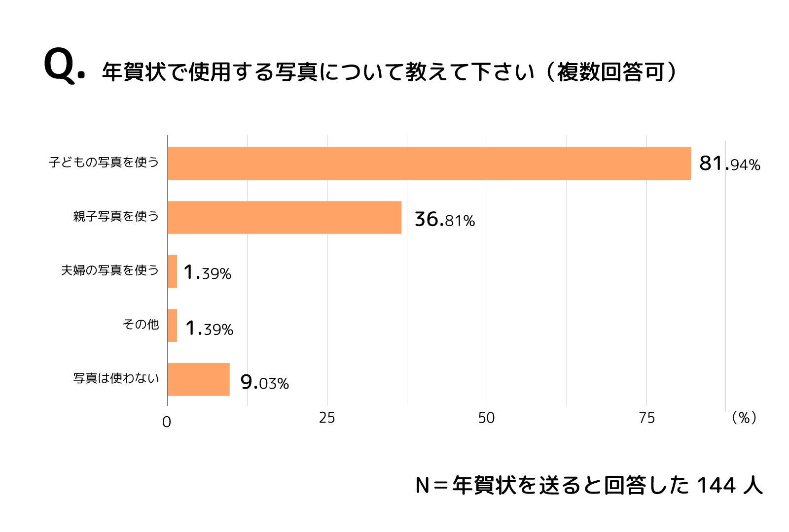 さらに、年賀状にどんな写真を使うかを質問したところ、「子どもの写真を使う(81.94%)」が8割を超え一番多く、次いで「親子の写真を使う(36.81%)」「夫婦の写真を使う(1.39%)」が続き、子どもの存在が年賀状を送る一番の理由になっていることが分かる結果となりました。