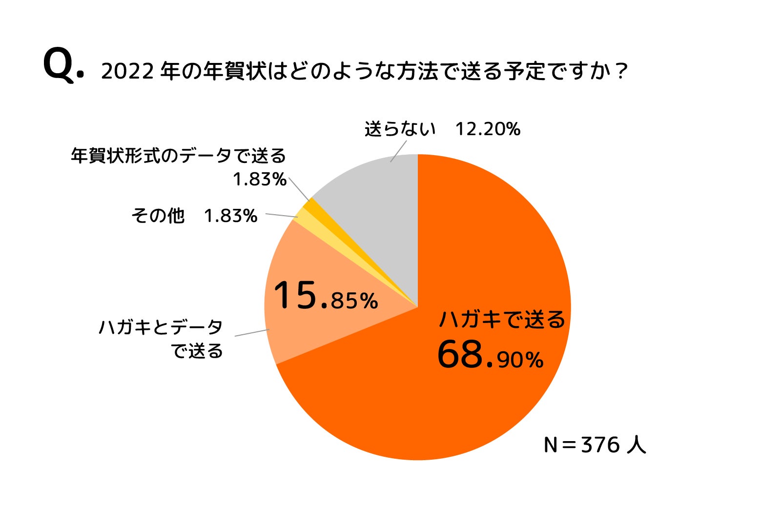 調査の結果、2022年の年賀状を送付するか聞いたところ、「ハガキで送る(68.90%)」「ハガキとデータの両方で送る(15.85%)」合わせて84.76%で、保護者の8割以上がハガキで年賀状を送付する予定であることが分かりました。