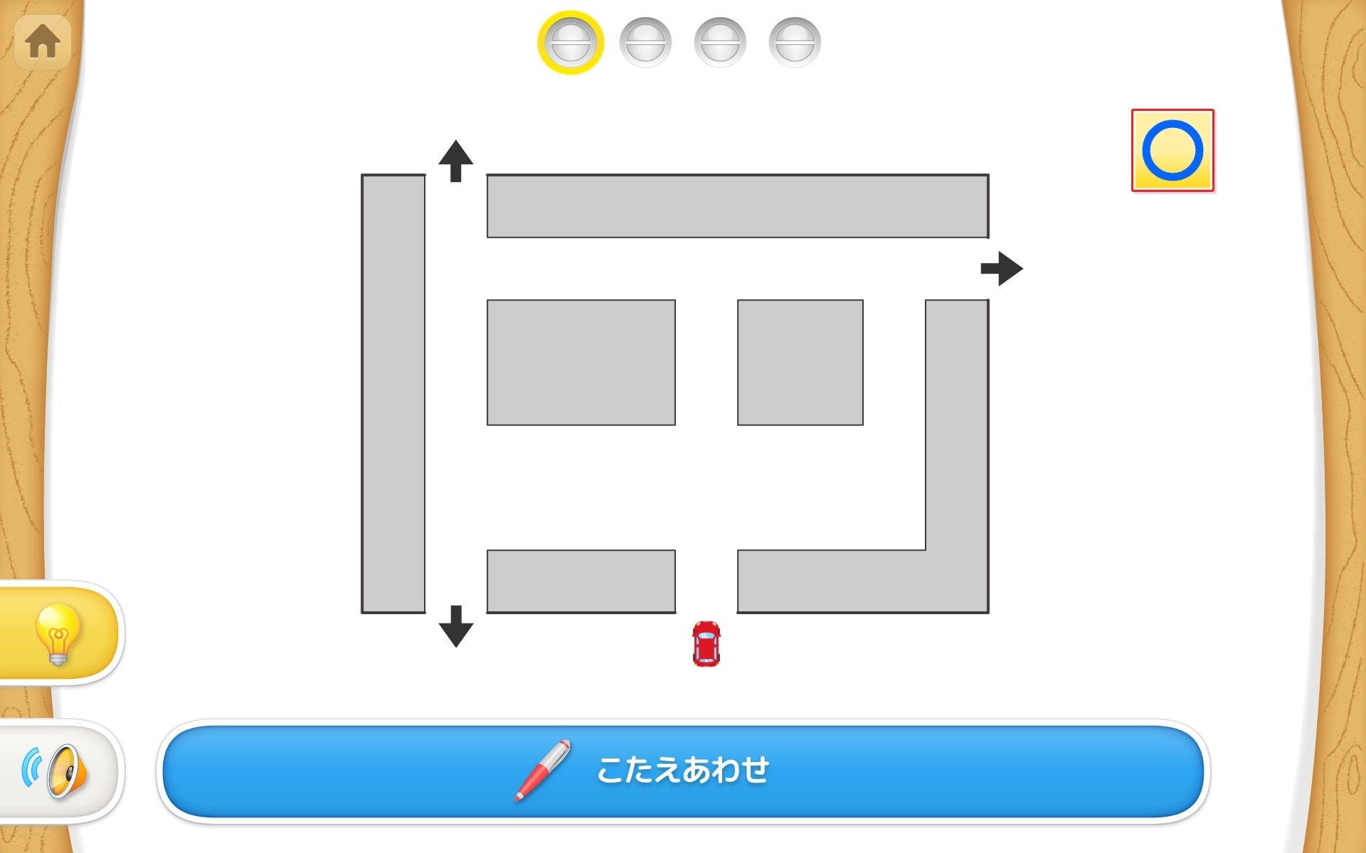この問題の「車が壁にぶつかると左に曲がる」というルールは、「車が上下左右どの向きに進んでいたかで、左に曲がった後の車の向きが決まる」ということを正しく理解する必要があります。これは「右は右手(おはしを持つ手)のある方」「左は左手(お茶わんを持つ手)のある方」のように「自分から見たときに右か左か」で理解しているお子さんにとっては一歩進んだ内容になります。