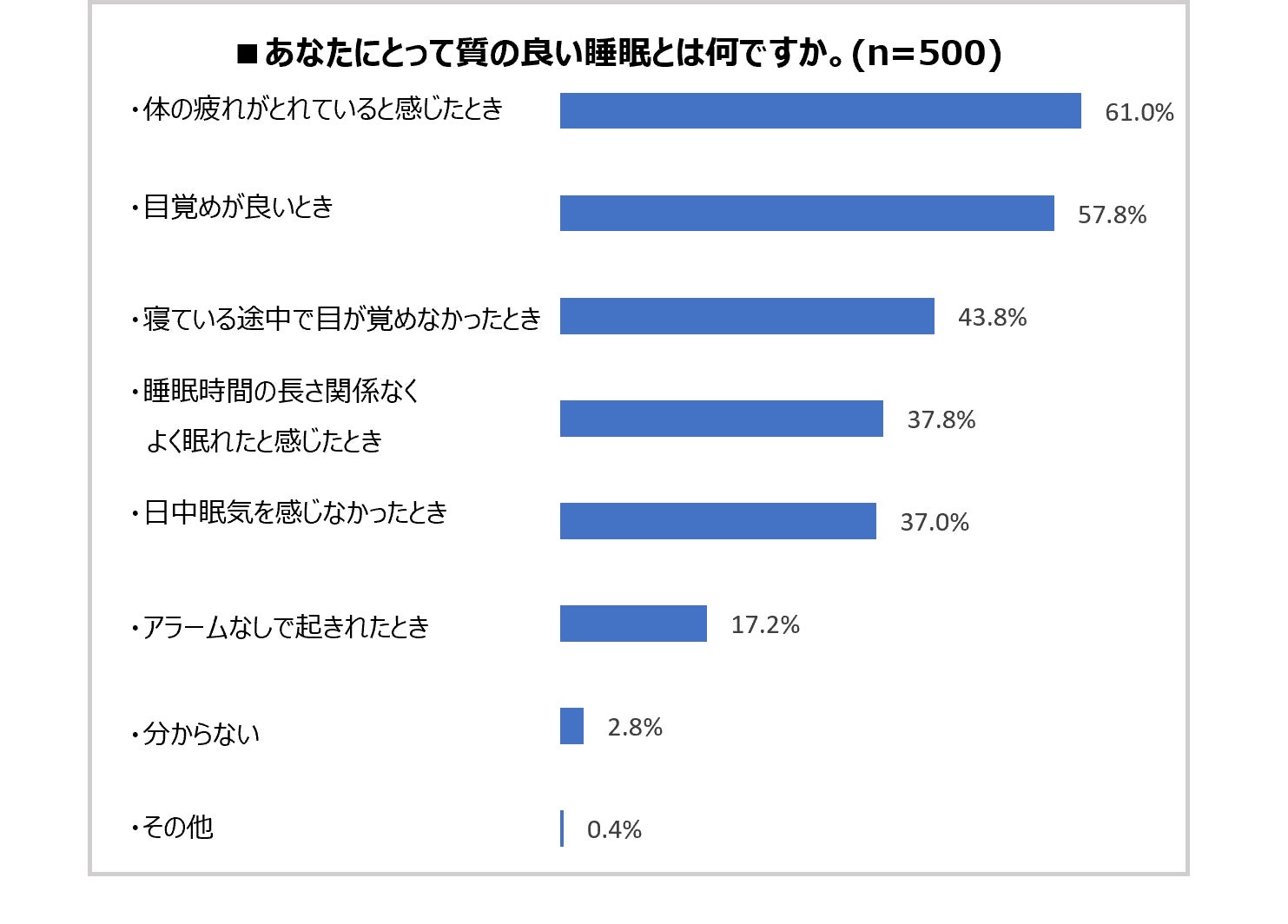 - 約8割が質の高い睡眠をとれた日は「日中のパフォーマンスが向上」「ストレス軽減を感じる」と回答!質の良い睡眠の定義は「体の疲れがとれていると感じた時」の回答が最も多く約7割が睡眠不足や質の低下によって体の不調を感じていることが判明