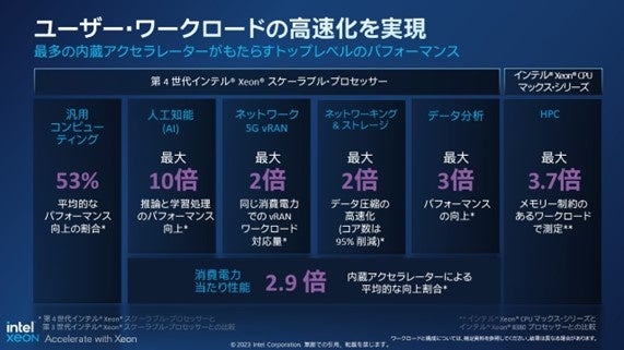 データセンター、ネットワーク、インテリジェント・エッジなど、数十年にも及びイノベーションを率いてきたリーダーシップを基盤に構築されたこの最新の第4世代インテル® Xeon® プロセッサーは、世界中のあらゆるCPUの中で最多のアクセラレーター( https://download.intel.com/newsroom/2023/data-center-hpc/4th-Gen-Xeon-Accelerator-Fact-Sheet.pdf )を内蔵し、トップレベルのパフォーマンスを実現して、AI、アナリティクス、ネットワーキング、ストレージ、HPCと幅広い用途にわたり、顧客企業が最も重視するコンピューティングの課題を解決します。