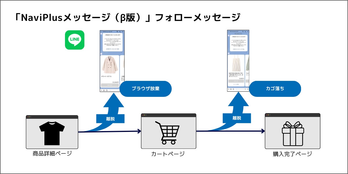 「NaviPlusメッセージ(β版)」は、ECサイト訪問者の行動データをもとに、最適なタイミングでLINEのメッセージを自動配信するサービスです。商品詳細ページの閲覧やカートへの商品追加後、購入に至らなかったユーザーごとに、閲覧商品やおすすめ商品を紹介するパーソナライズされたメッセージを自動送信することで、サイトへの再訪問を促し、売上機会の最大化を図ります。