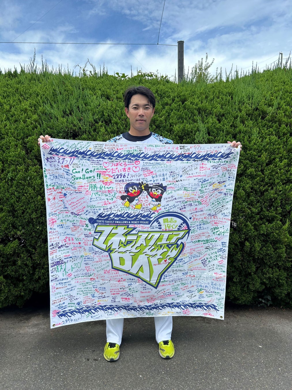 また月間大賞の受賞を記念し、2024年8月14日(水)明治神宮野球場で開催された「闘志がつなぐ! マネースクエアDAY」においてファンの皆様に手書きで作成いただいた「応援メッセージ横断幕」を、選手を代表して星知弥投手にお受け取りいただきました。