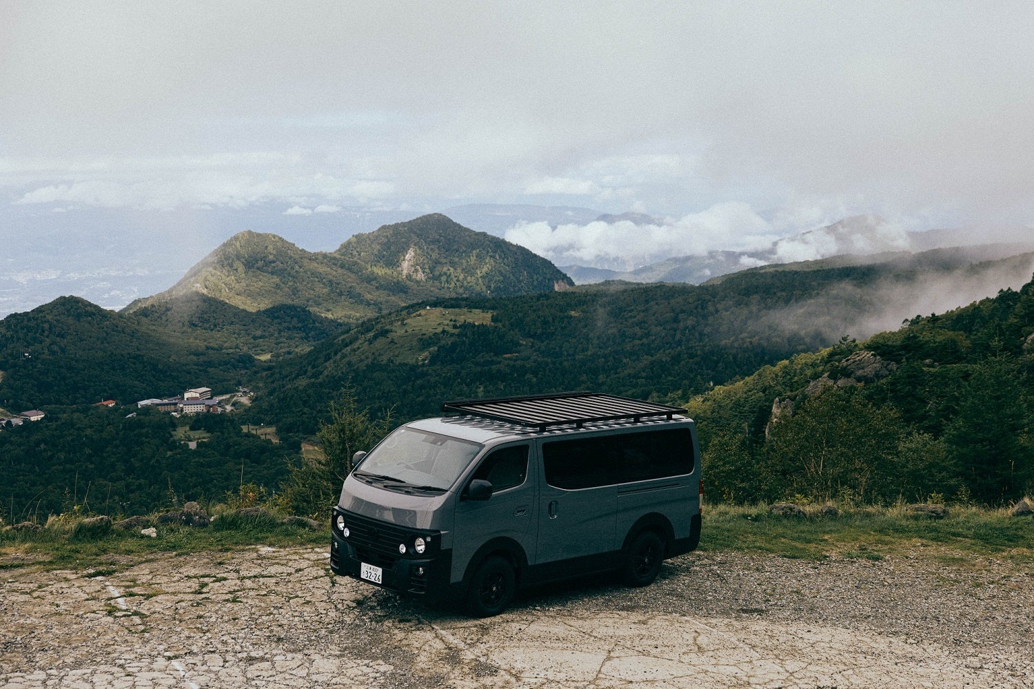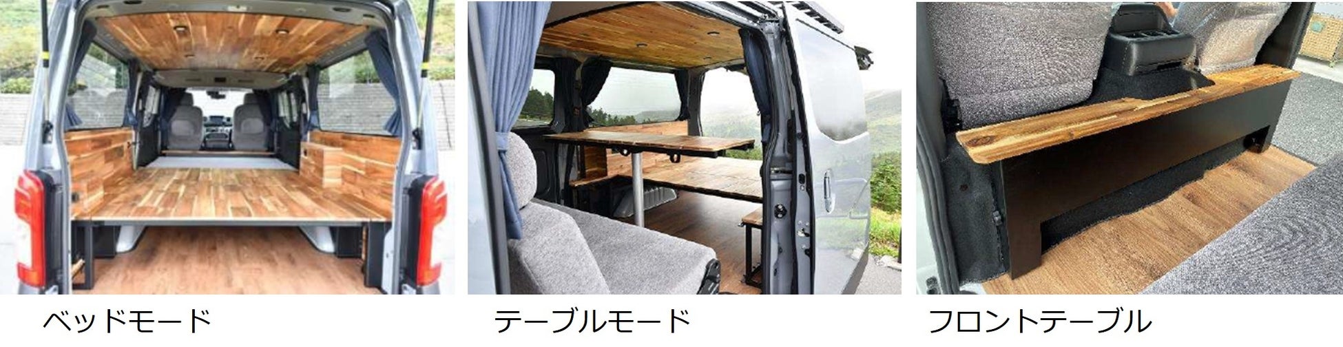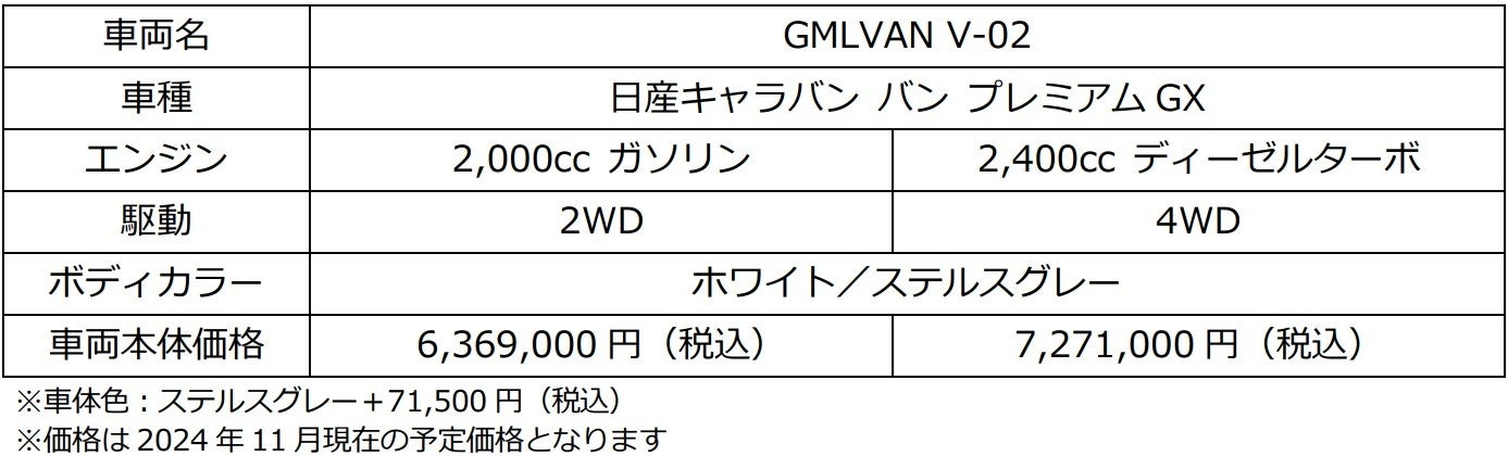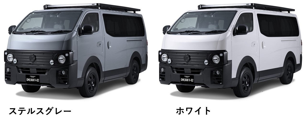 このたび発売する「GMLVAN V-02」は、「日産 キャラバン」をベース車両に採用した車両となります。丸目に仕上げたフロントフェイスをはじめ、フレキシブルな車内構造や天然木(アカシア)を使用した内装など、GMLVAN V-01のアイデンティティを踏襲しました。ボディカラーはステルスグレーとホワイトの2色展開。さらに新たにアラウンドビューモニターといったサポート機能やオートスライドドア、外部入力AC電源などを搭載し、お出かけやキャンプ時の快適性・利便性を充実しています。
