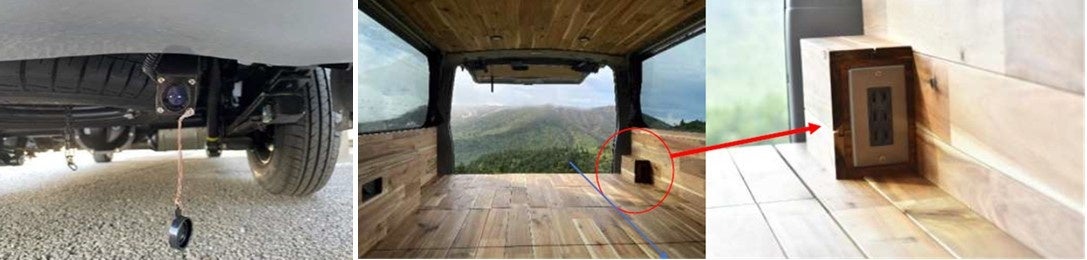 リアバンパー部分から外部入力可能な電源ポート付で、付属のAC電源ケーブルをつなぐと室内コンセントからAC電源の取り出しが可能です。※附属AC電源ケーブル3m、3口コンセント
