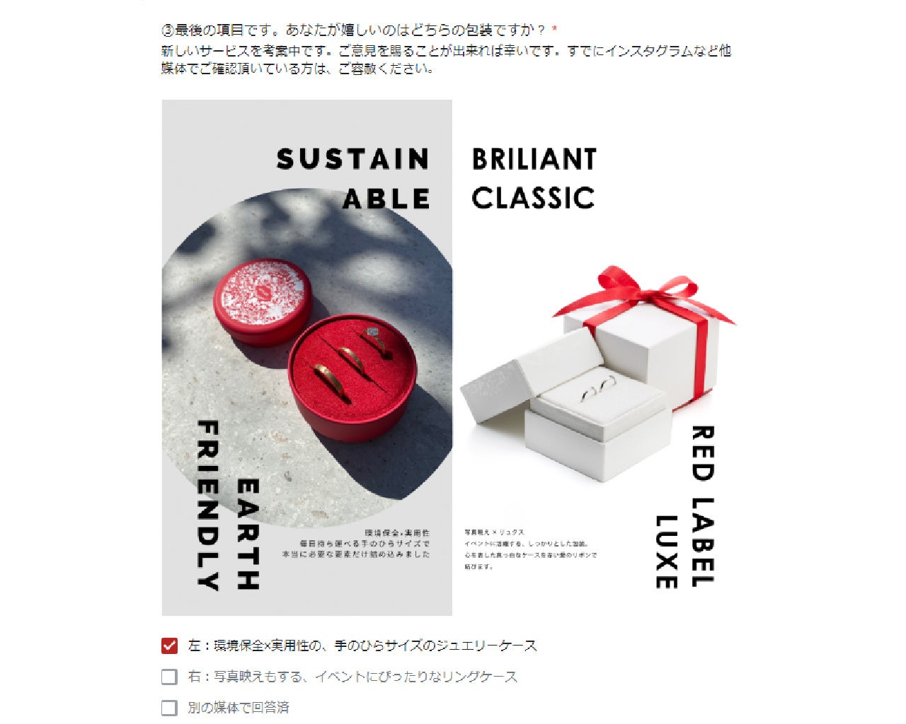 実際に、環境保全や実用性を兼ね揃えた新しいジュエリーケースが、今のご夫婦にどれだけ役に立つのだろうか。約半年間で、事前予約来店をされたカップルに上記のアンケートにご回答をいただき、約6割強のカップルからご支持をいただきましたので、本運用をさせていただく形となりました。