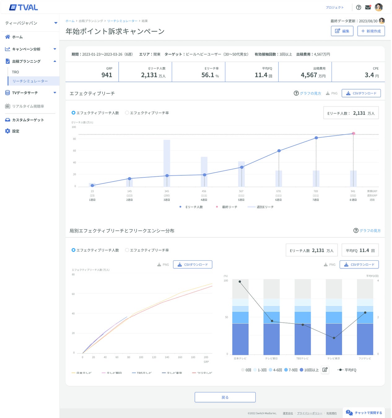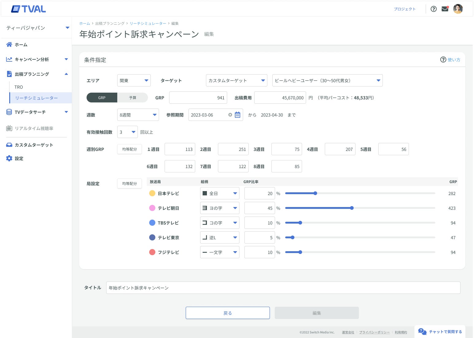 スイッチメディア、テレビCMの出稿金額、局配分、絵柄、フライトパターンからターゲットリーチを最大化するパターンを見つける『リーチシミュレーター』を「TVAL(ティーバル)」上で提供開始