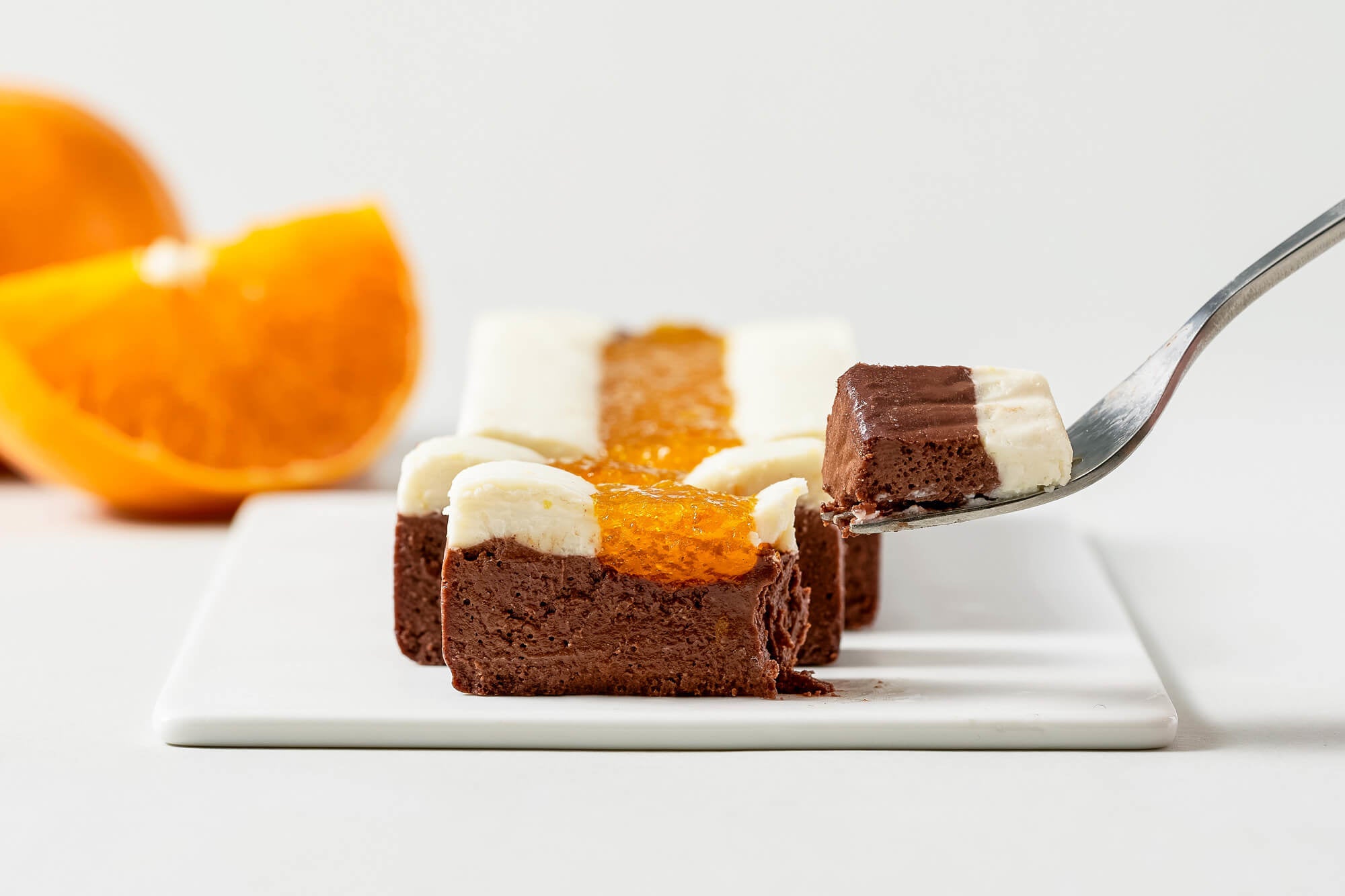 中央にはオレンジを混ぜ込んだスイートチョコレートとホワイトチョコレートのクリームを使い、オレンジの香りと甘味をプラスしています。