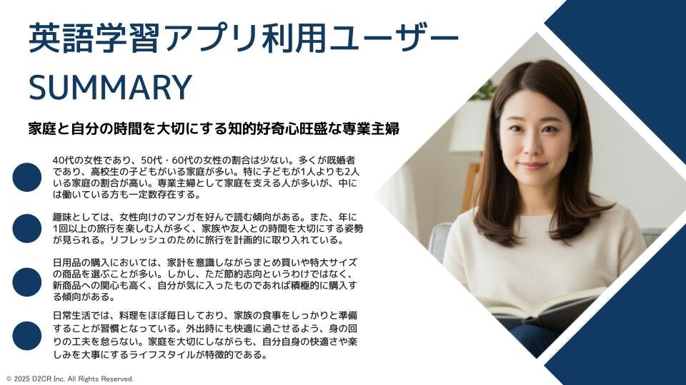 株式会社D2C R(本社:東京都港区、代表取締役社長:豊永 雅史、以下D2C R)は、株式会社NTTドコモ(本社:東京都千代田区、代表取締役社長:前田 義晃、以下ドコモ)が保有する1億超(※1)の会員基盤をベースにしたドコモデータ(※2)を活用したユーザープロファイル分析レポートの第12弾として、「英語学習アプリ」にフォーカスを当てた「英語学習アプリ利用ユーザープロファイリングレポート」を公開いたしました。