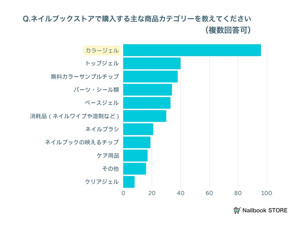 次いで「トップジェル」「無料カラーサンプルチップ」「パーツ・シール類」「ベースジェル」などが続き、日々の施術に欠かせない基本アイテムの需要がうかがえます。