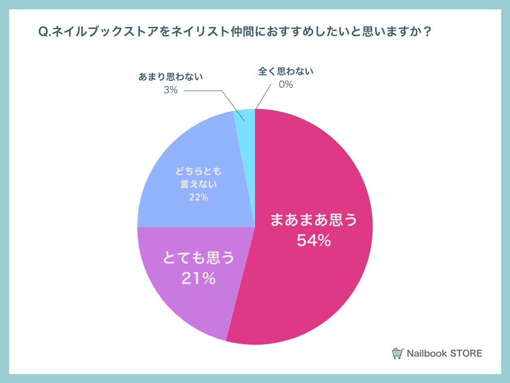 「ネイルブックストアをネイリスト仲間におすすめしたいと思いますか?」という問いに、「とても思う」「まあまあ思う」と回答した方は合わせて約75%にのぼりました。