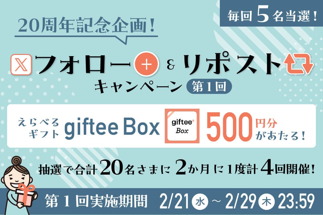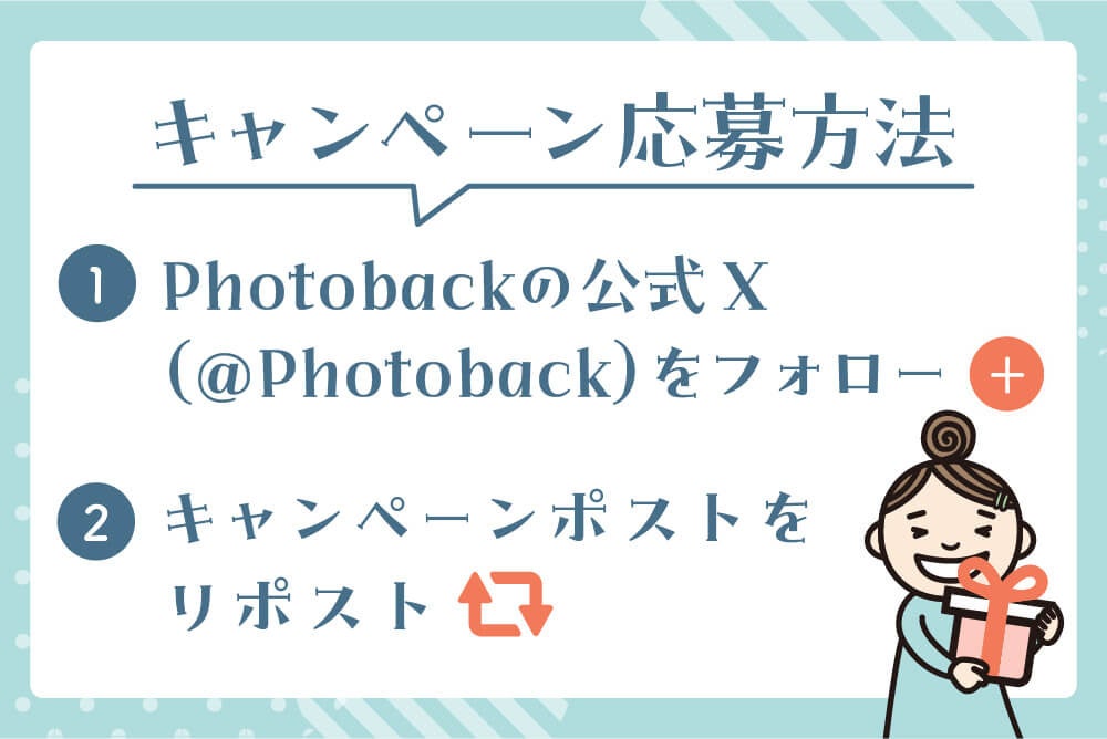 Photobackの公式Xアカウントのフォロー&RPキャンペーンを開催します。公式Xの該当投稿をリポストした方の中から、抽選で1回につき5名、合計20名さまにえらべるギフト「giftee Box」500円分をプレゼント!Xアカウントをお持ちの方はぜひご参加ください。